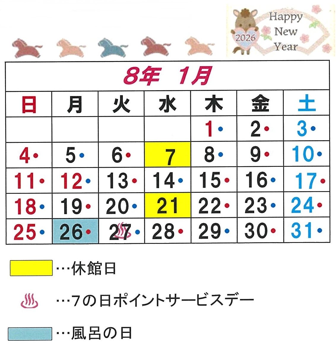 | 1月4日(日) | 平常通り営業(午前9時~午後10時) 入浴受付は午後9時15分終了 多目的風呂受付は午後8時30分終了 |