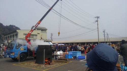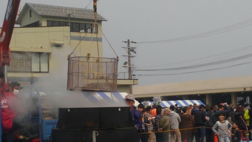 約4,000人分のホタルイカを茹でられる大釜をクレーンで吊る釜揚げコーナーでは、皆さんが豪快なその様子を写真撮影されていました。